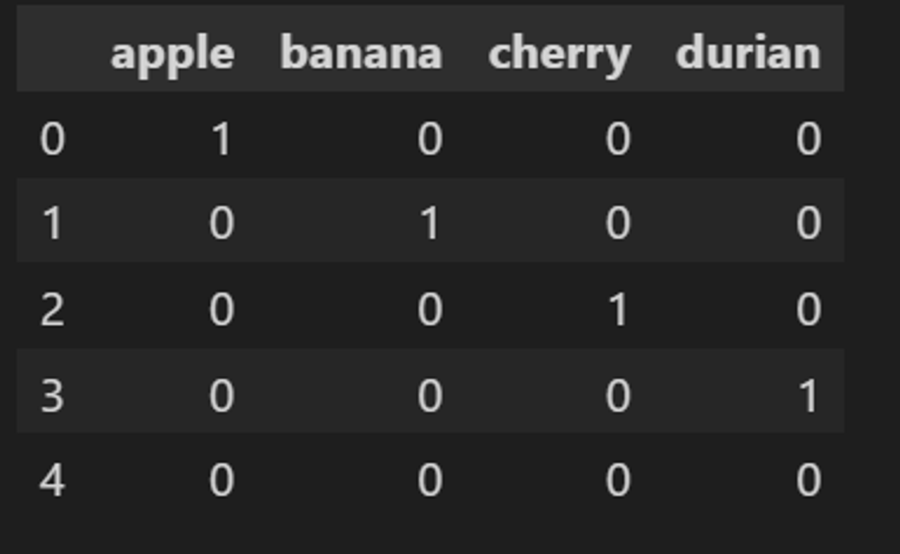 - 범주형 변수를 0 또는 1 값을 가진 하나 이상의 새로운 특성으로 바꾼 것