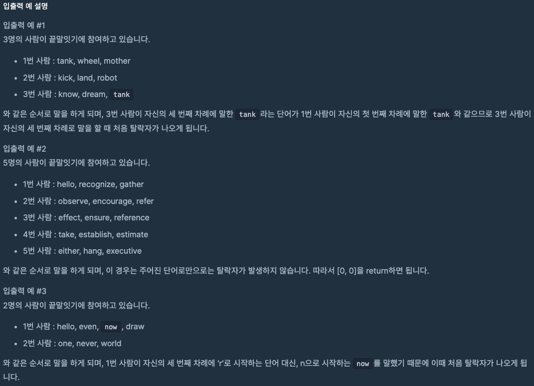- 조건에 만족하면 리스트에 추가(append)하는 방식으로 끝말잇기 진행